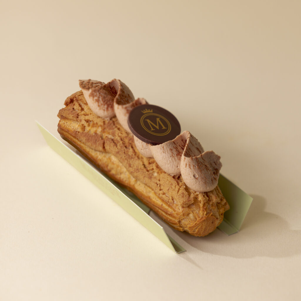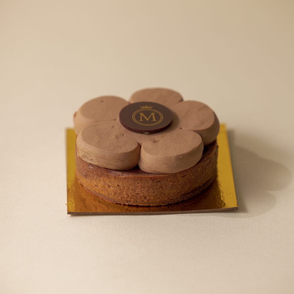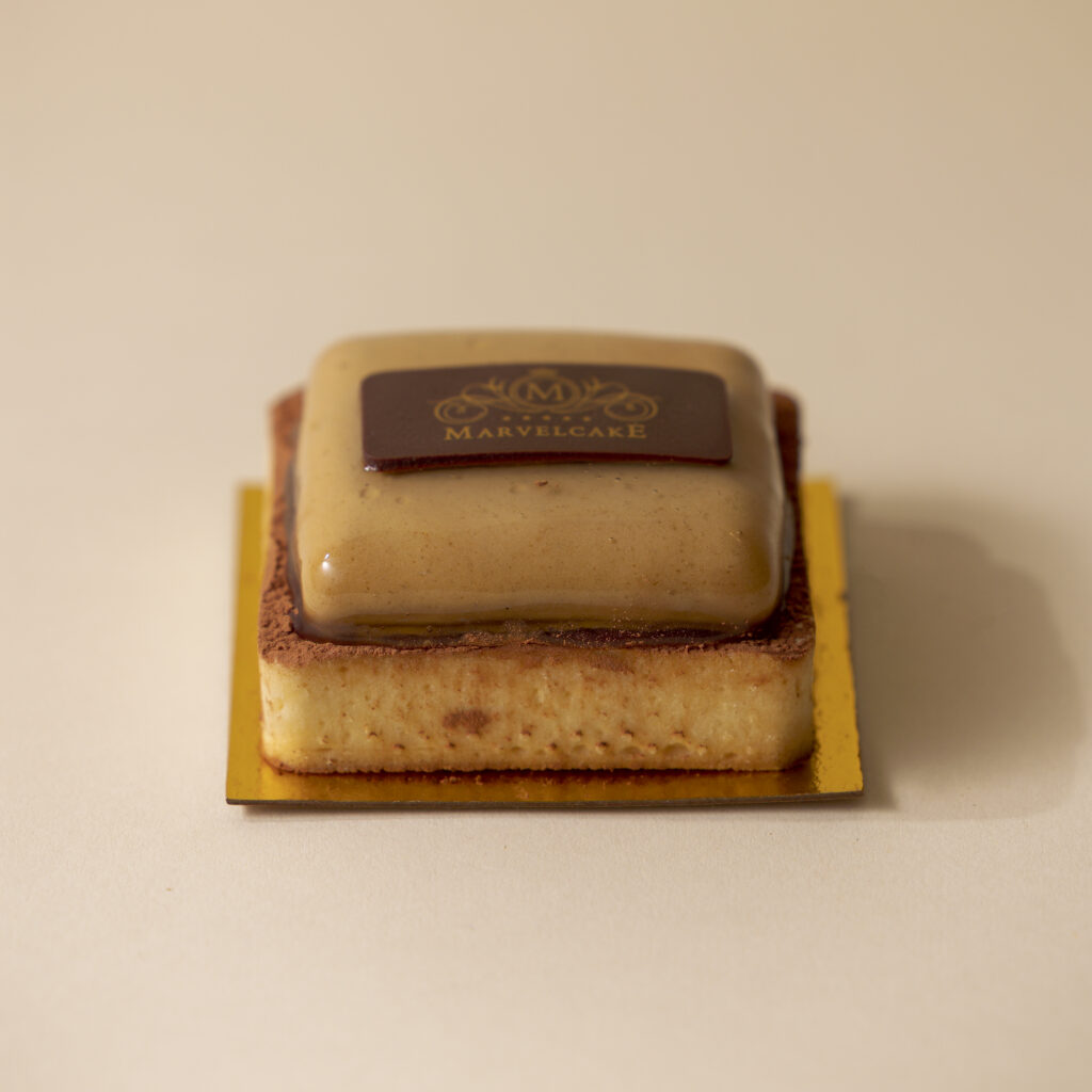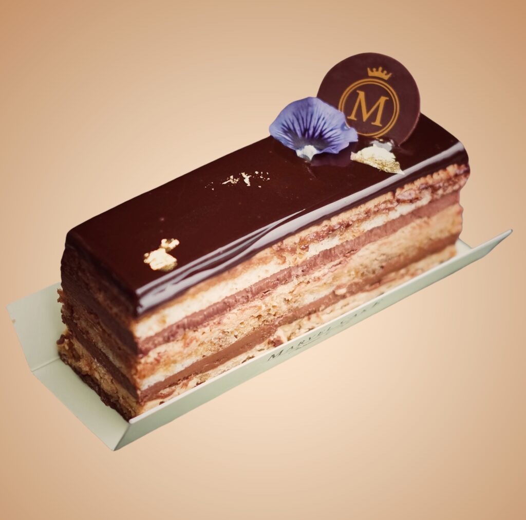 A layered patisserie of almond joconde cake, silky coffee buttercream and finished with a shiny layer of chocolate glaze.