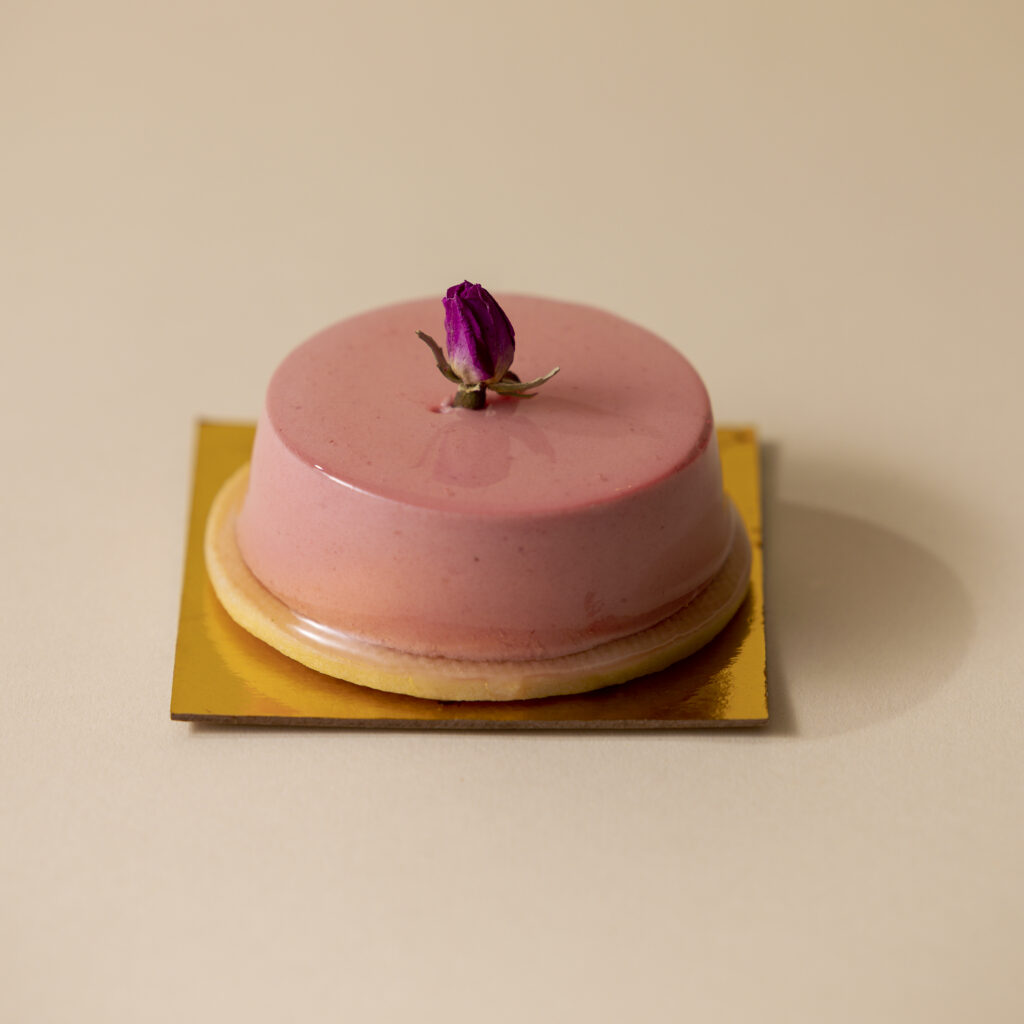Thin crust filled with strawberry mousse and decorate with Persian dried Rose.