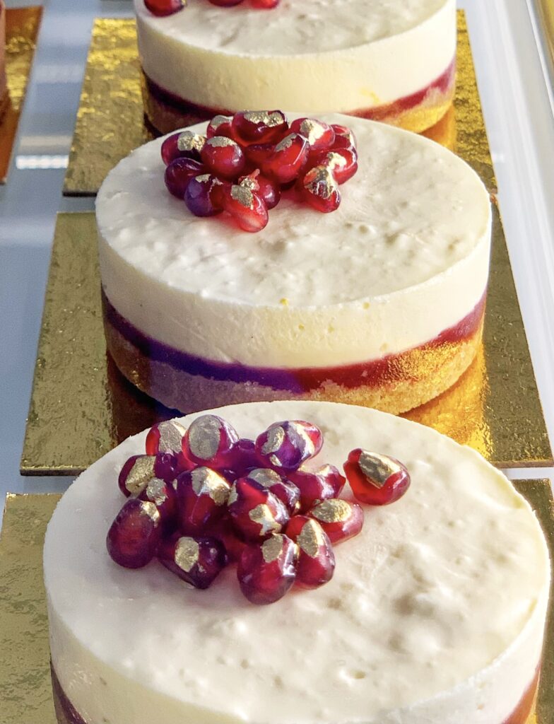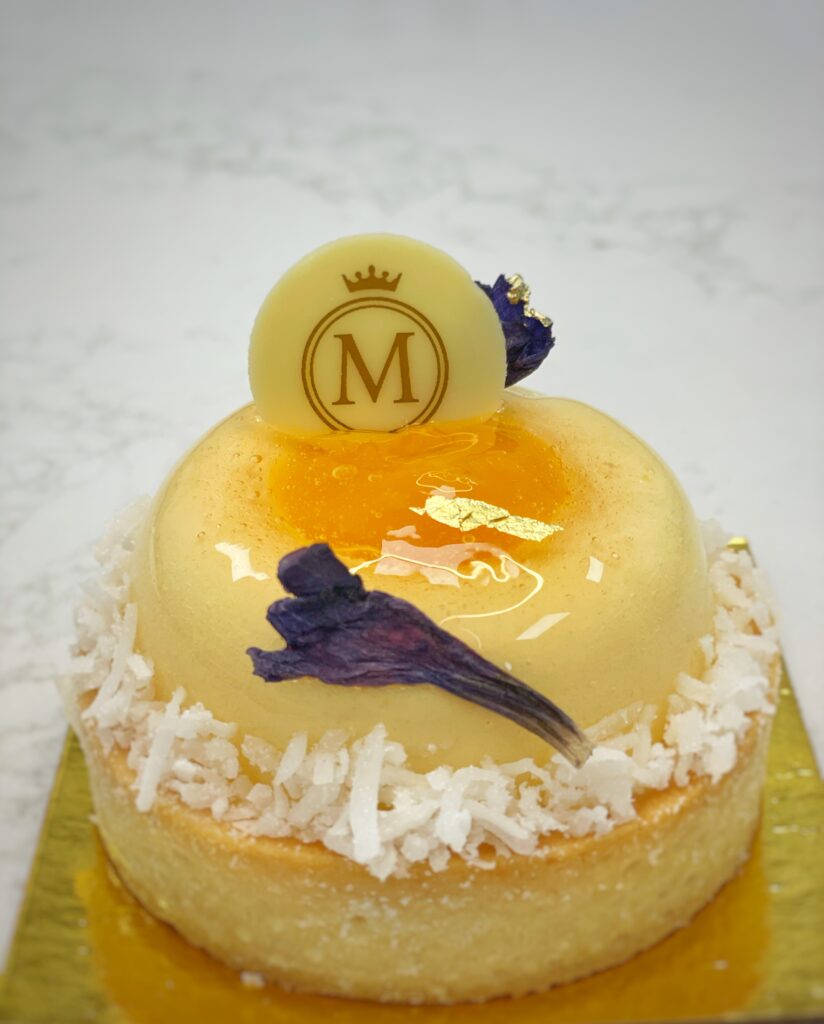 Our seasonal Mango passion fruit tart is made with our homemade tart, mango puree with passion fruit mousse decorated by star flower and gold leaves.